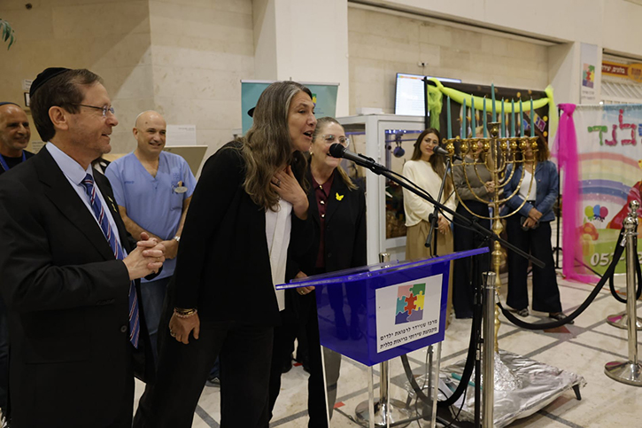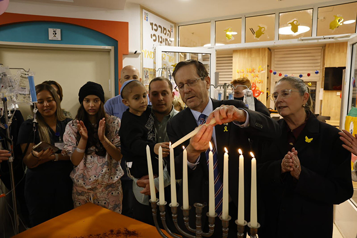 הנשיא נפגש עם מנהלת מרכז שניידר, פרופ’ אפרת ברון-הרלב, והדליק את נרות החג יחד עם שני ילדים מטופלים, תוך שיחה עם הצוותים הרפואיים ועם משפחות המאושפזים.